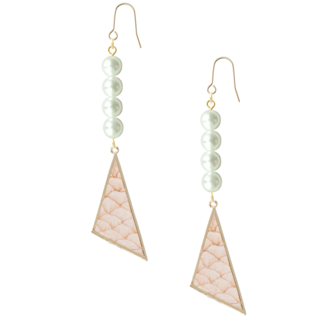 白いパールとベージュのレザーを組み合わせたこのピアスは、丸い形状に中間パーツとトライアングルのチャームが加わり、個性あふれるスタイルを演出します。真鍮を使用したゴールドの変形デザインが、耳元を華やかに彩り、洗練された雰囲気を醸し出します。
