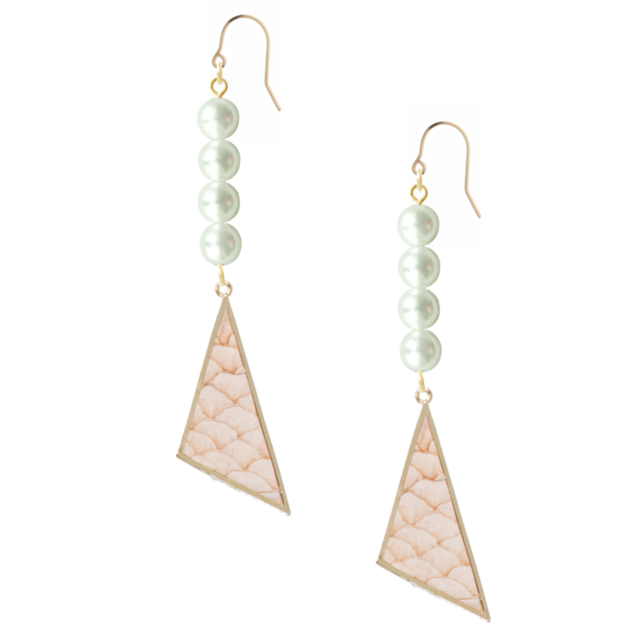 白いパールとナチュラルなベージュのレザーを組み合わせたこのピアスは、まあるい形状の中間パーツと三角形のチャームが絶妙に調和し、個性豊かなスタイルを引き立てます。使用している金具は14KGF(ゴールドフィルド)で、金の輝きが上品さを加え、洗練された雰囲気を醸し出します。