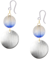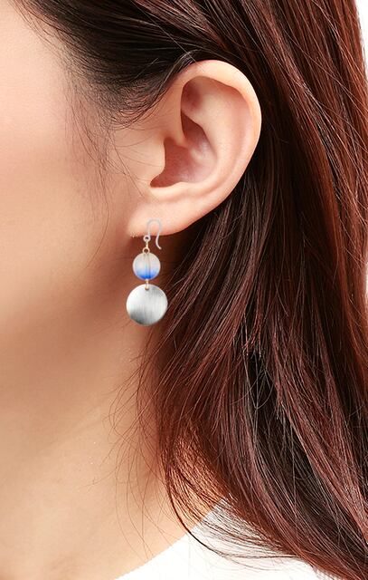 静かな青と穏やかなブラウンが絶妙にグラデーションした樹脂フックピアス。樹脂ヴィトライユの丸玉が涼やかな印象を与えます。シルバーのメタルプレートが上品さを引き立て、洗練された印象を演出します。大人の女性にぴったりの落ち着いたカラーリングとデザインで、日常使いから特別な日の装いまで幅広く活躍してくれること間違いなし。穏やかなブルーとブラウンの色合いが、心を癒し、静かな気持ちを求める方に最適です。