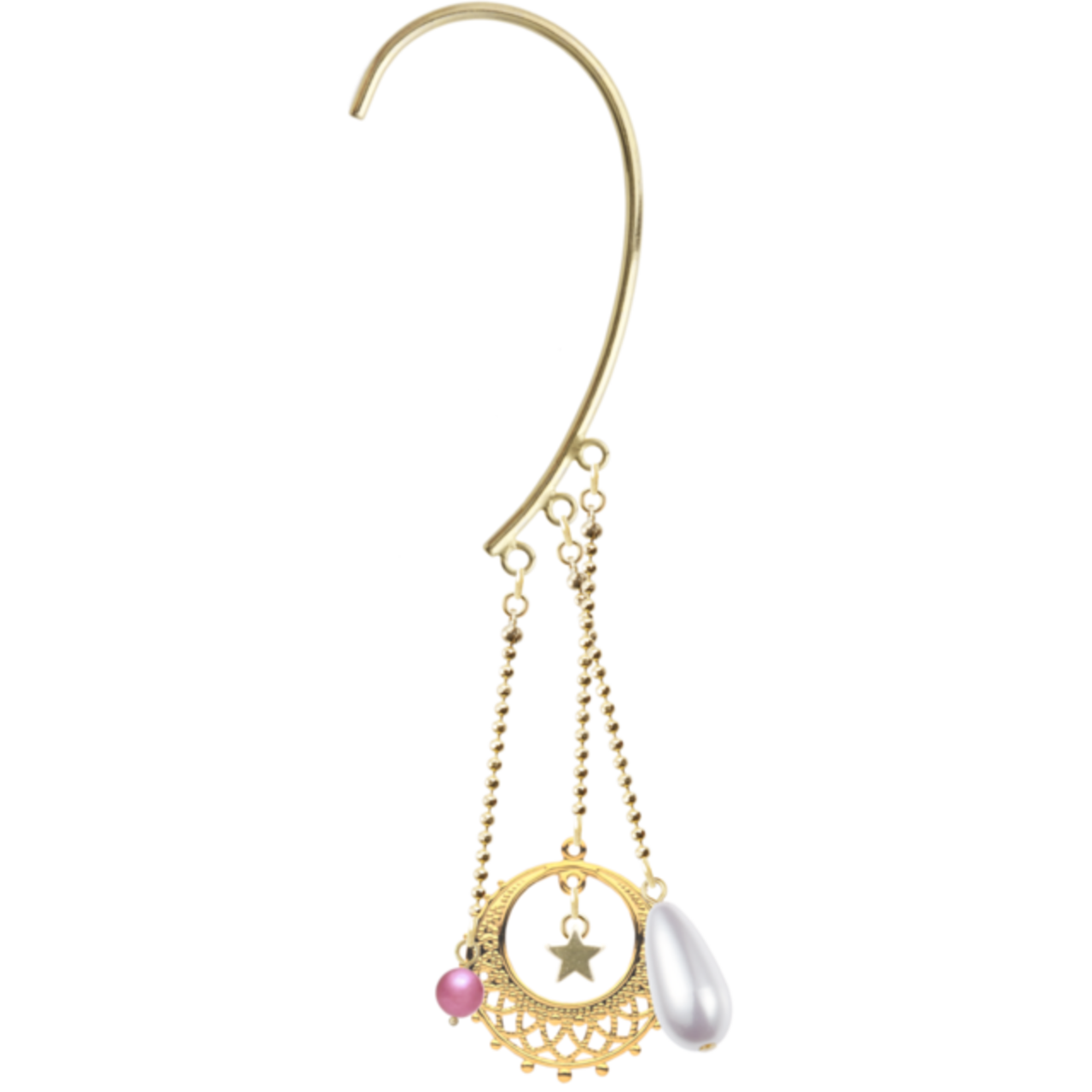 星空をイメージした夜空の贈り物。華やかな3cmのイヤーフックに、ピンクのパールやスカシアラビアンラウンドパーツがキラキラ輝くデザインです。立体メタルパーツがアクセントとなり、おしゃれな印象を与えます。