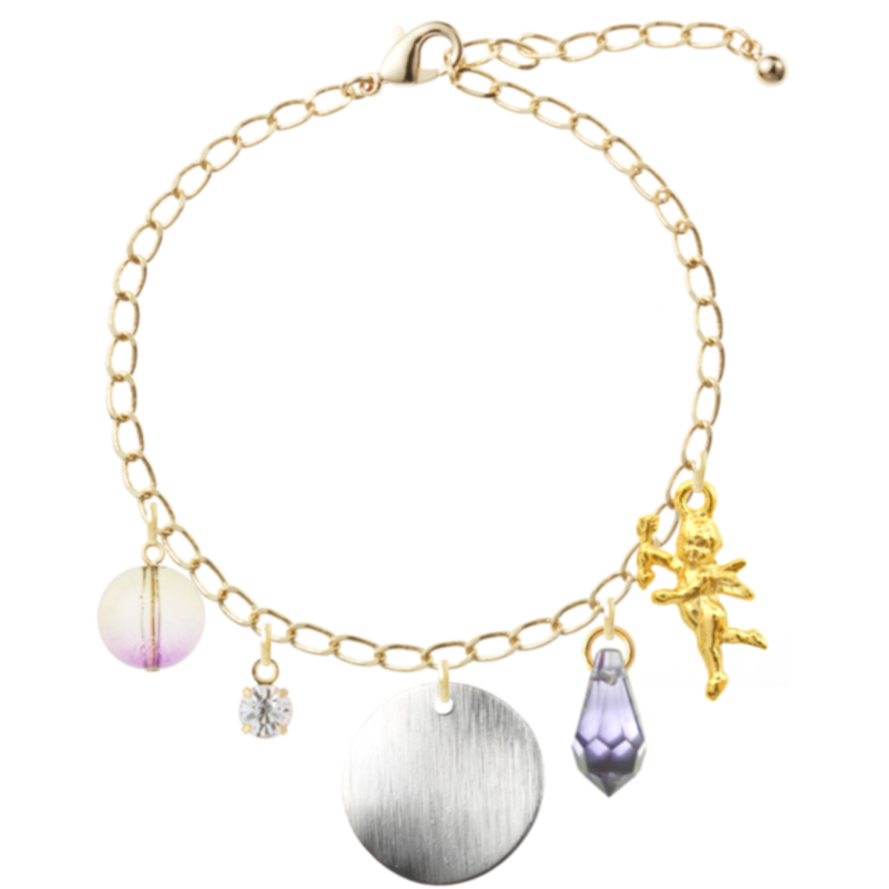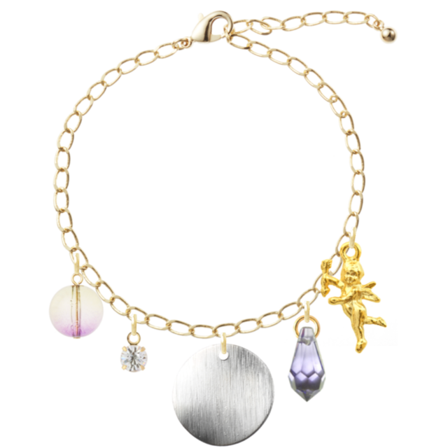 夢を叶える力を宿したエンジェルチャームが輝くブレスレット。シルバーキヘイチェーンには、スワロフスキーやタンザナイト、ダイヤパーツなどの美しいパーツがエレガントに配置されています。グラデーションのイエロー×パープルの樹脂ヴィトライユ丸玉が、優しく輝きを放ちます。大切な人への贈り物や自分へのご褒美にも最適です。夢を追いかけるあなたへ、幸運と成功をもたらす一本。お気に入りのアクセサリーとして、日々の生活を豊かに彩りましょう。