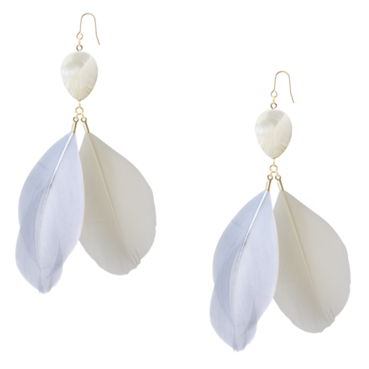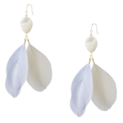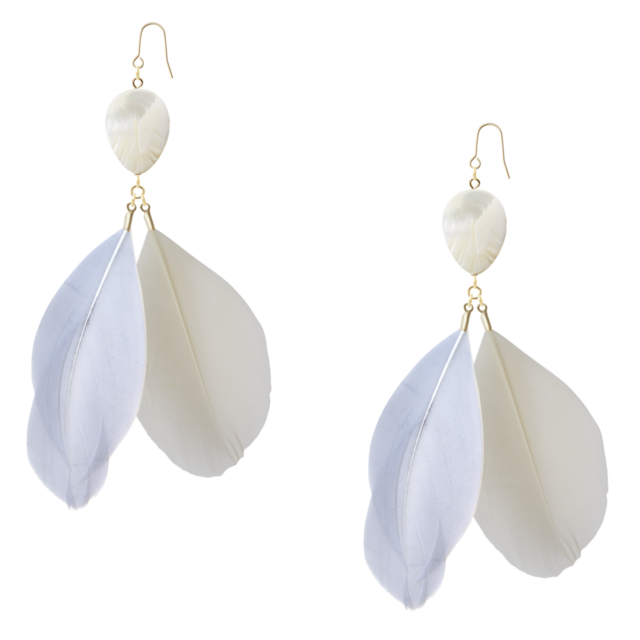 輝くひとたち1は、ガチョウの羽を使用したシェルホワイトのフックピアスです。羽の中間に2点のパーツがついたデザインは、存在感がありながらも上品で洗練された印象を与えます。自然の美しさを感じさせるリーフモチーフがさりげないアクセントとなっており、どんなシーンでも華やかさを演出します。軽やかな着け心地で、長時間つけていても疲れにくいのも嬉しいポイントです。