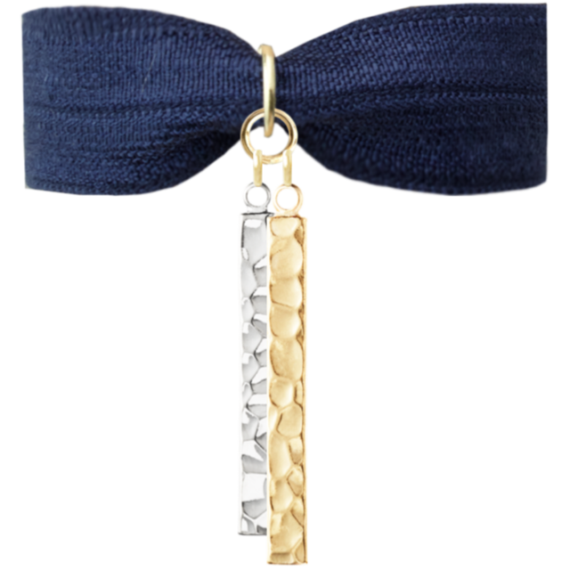 ヘアタイブレスレッド「輝くひとたち2」は、ネイビーの糸に水面をイメージしたデザインメタルバーがついています。シンプルながらも存在感のあるデザインで、ヘアアクセサリーとしてもファッションアイテムとしてもお使いいただけます。金と銀のメタルバーがアクセントになり、普段のコーディネートを華やかに演出します。