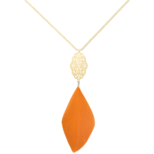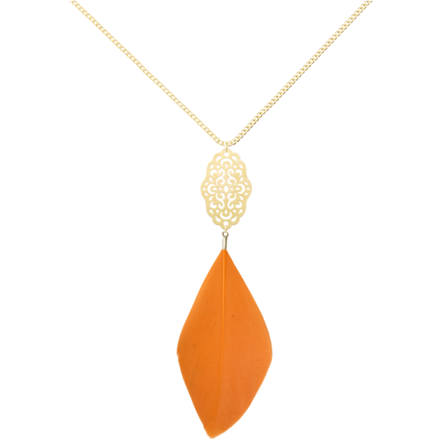 このネックレスは、ガチョウモチーフとオレンジの鮮やかな色合いが特徴で、身に着けるだけで華やかさをプラスしてくれます。美しいダマスクスカシプレートのデザインが、シンプルながらも存在感を放つアクセサリーに仕上がっています。