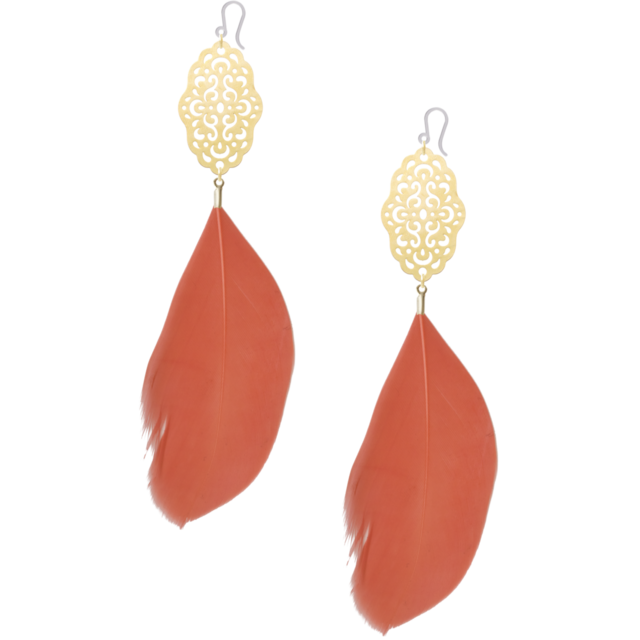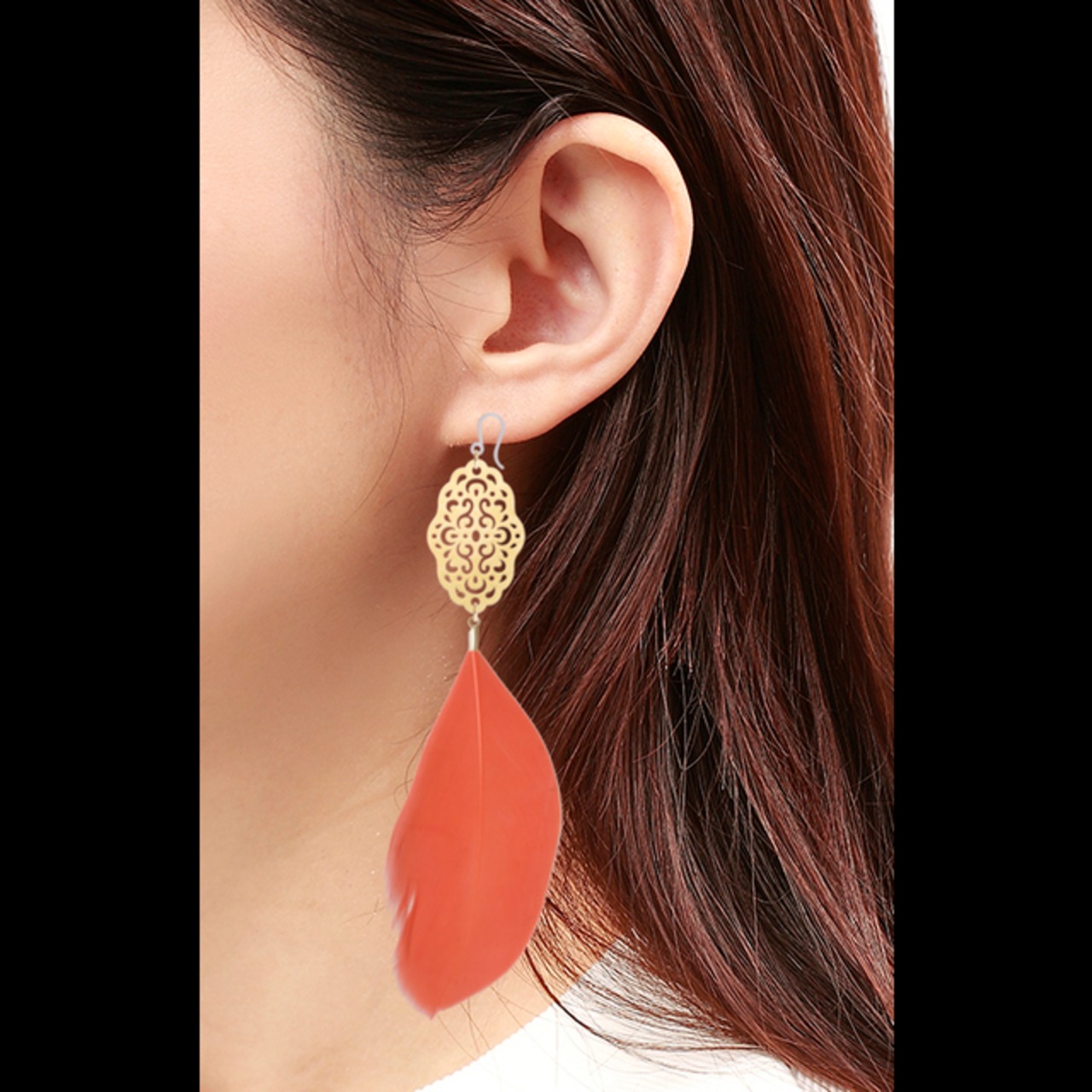 輝くひとたち(ピアス/16)は、美しいサーモンピンクのカラーが特徴のアクセサリーです。ガチョウの形をしたチャームが、優雅でありながらも遊び心を感じさせるデザインに仕上がっています。細やかなダマスクスカシプレートが光を受けてキラリと輝き、耳元で存在感を放ちます。