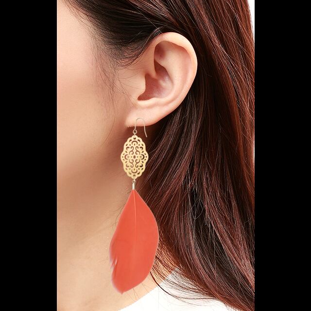 こちらは、ダマスクスカシプレートを使用したフックピアスです。ガチョウをモチーフにしたデザインが、遊び心と大人の魅力を演出します。美しいサーモンピンクの色合いは、肌馴染みが良く、優しい印象を与えてくれます!