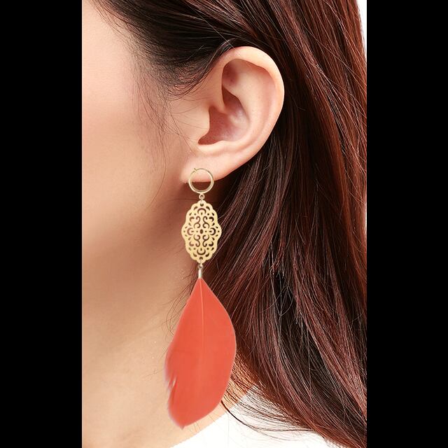 「輝くひとたち(イヤリング/No18)」は、ダマスクスカシプレートを用いた美しいデザインが特徴のアクセサリーです。サーモンピンクのガチョウモチーフが、柔らかな印象を与え、華やかさと上品さを兼ね備えています。光を受けるたびにキラキラと輝き、どんな装いにも華やかさをプラスします。