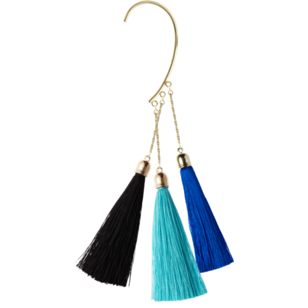 ハイセンスな輝きを放つのは、『輝くひとたち(イヤーカフ/No211)』。その存在感、まばゆさに誰もが引き込まれることでしょう。ユニークな金属チェーンや贅沢なタッセル、煌めくスカイブルーとブルーのパーツが絶妙に組み合わさり、まるで空を映したような美しい輝きを放ちます。