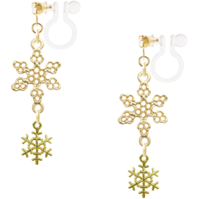 キュートな雪の結晶チャームが輝くひとたち(イヤリング/No219)。小ぶりながら存在感のあるデザインは、どんなスタイルにもぴったりです。アレルギー対応素材を使用しており、安心して長時間身に付けることができます。ゴールドと銀のコンビネーションが華やかで、周りの視線を集めること間違いなし!星やスカシなどの中間パーツがおしゃれなアクセントになっています。