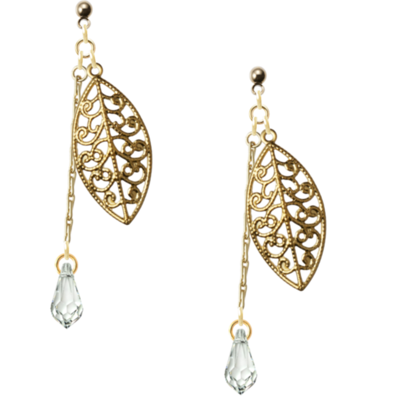 このピアスは、自然をテーマにしたデザインが特徴です。葉のチャームが優雅に揺れ、まるで森の中を散歩しているかのような心地良さを感じさせます。また、スワロフスキーとクリスタルの輝きが加わり、純粋で浄化されたエネルギーを放っています。どんなシーンでもさりげなく存在感を演出してくれる、一品です!